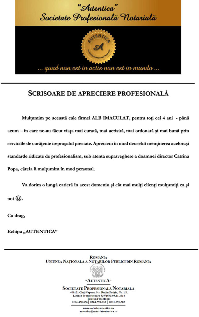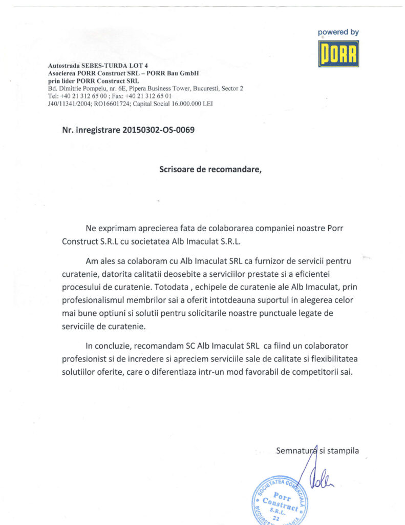 Colaborând cu ALB IMACULAT SRL în cadrul proiectului de curățenie pentru autostrada Sebeș–Turda, putem confirma calitatea excepțională și eficiența serviciilor prestate. Calitatea și flexibilitatea soluțiilor propuse o diferențiază favorabil față de concurenții săi.